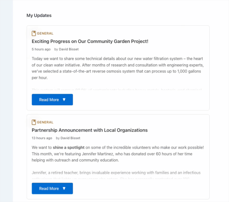 Once you’ve published an update, getting it in front of donors is effortless. Campaign Updates gives you three flexible ways to display updates on your site. Remember, there is no coding required at all!