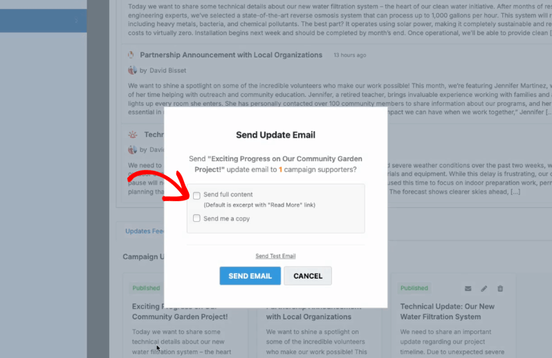 Publishing a great update is only half the story – getting it into your donors’ inboxes is where the magic happens. Campaign Updates gives you full control over how and when emails go out.