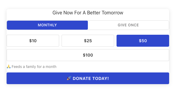 💬 Show the impact of every dollar: Attach a custom message to each amount (“feeds a family for a month” at $25, “sponsors a child’s education” at $50) so donors understand exactly what their gift does.